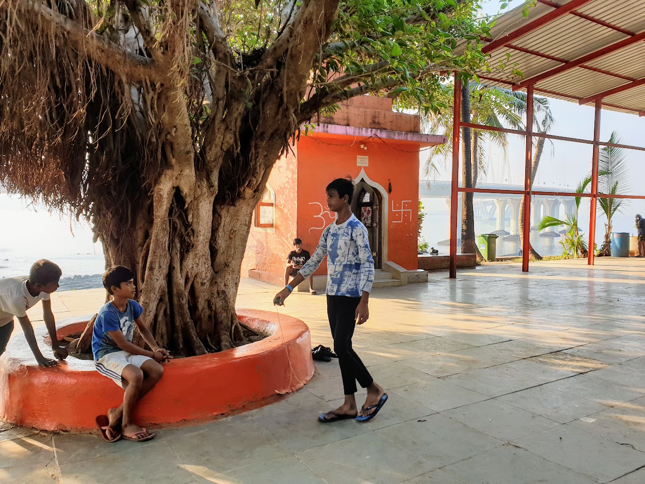 There is a nice courtyard in the temple complex from where one can get great views of the sea link. There were a bunch of young boys who were spending their holiday morning practicing spinning their wooden tops with string. I watched them with awe, as they deftly spun the top and did various tricks with the top.