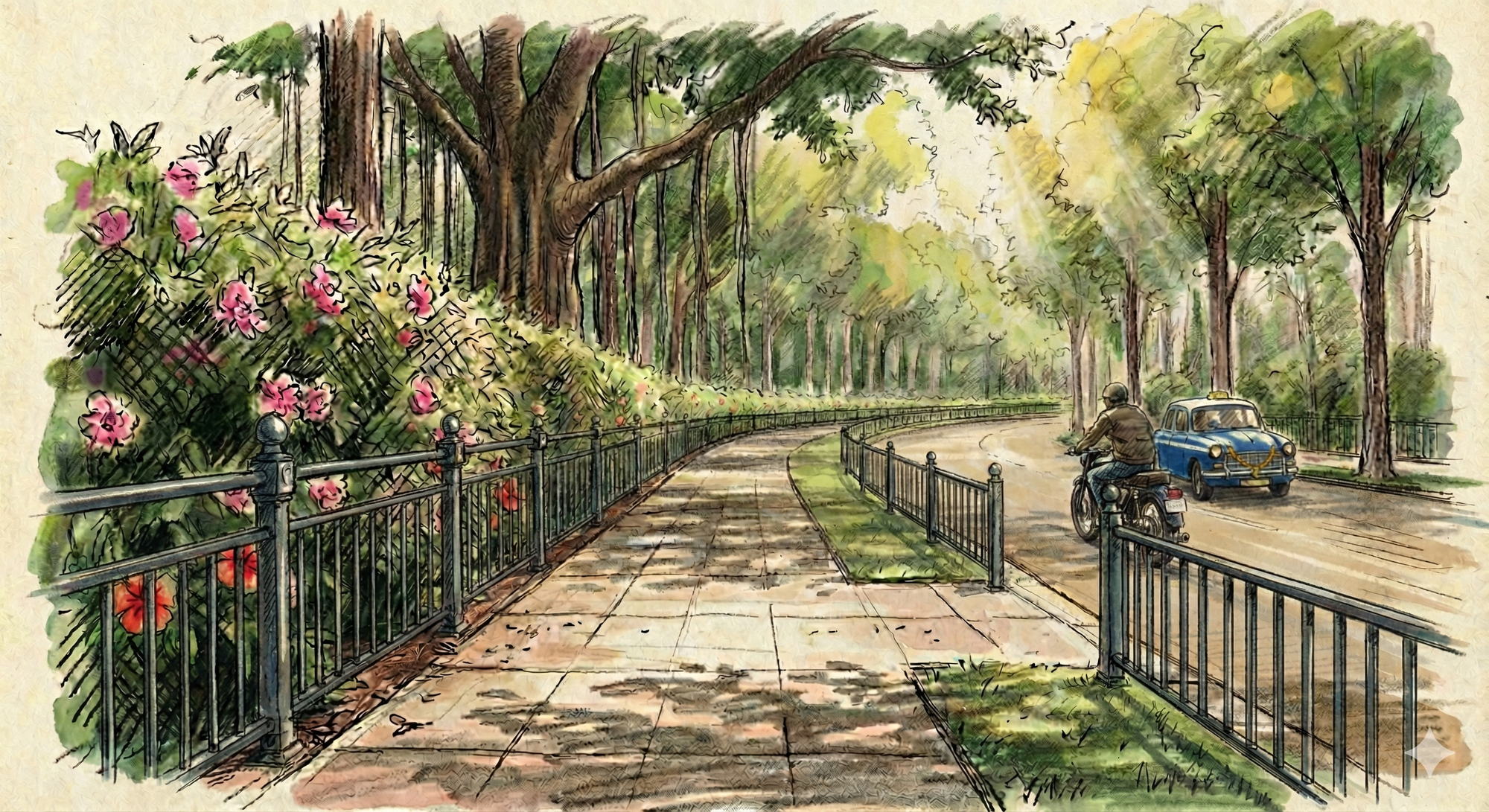 The Mumbai street sketch was an exercise in combining two photographs. But the real exercise was in attention. Training myself to see the pattern of light through leaves, the geometry of shadows on stone, the shapes that my mind wanted to skip over in its rush to label and move on.