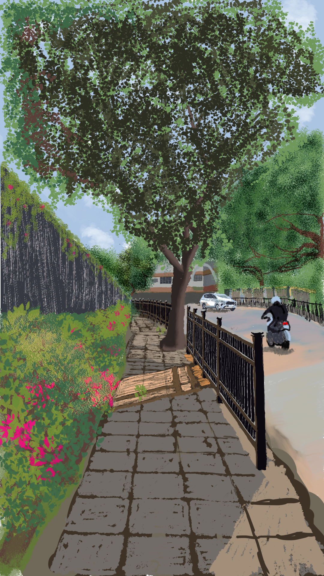 This piece combines two photographs from my daily morning walks in Mumbai to the hospital. One captured a tree-lined sidewalk on the road to the hospital. The other featured a pink flowering vine spilling over a hedge in the hospital where I was spending time attending to a medical emergency. The sketch in this post is an expression of hope I felt when I saw a ray of sunlight illuminating my path after long and tense days of waiting in the hospital.