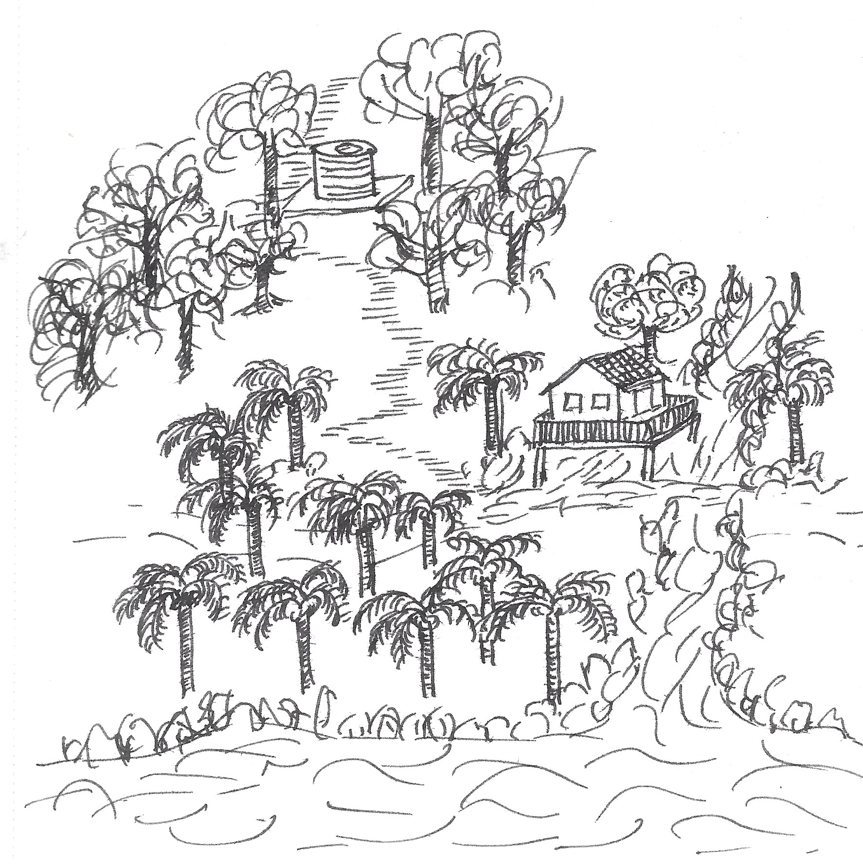 Earlier, when I tried to draw a tree, my mind said "tree" and immediately retrieved a symbol. Something I must have learned in childhood. A brown trunk. A green cloud on top. Maybe some lines for branches. I did not draw what's in front of me. I drew what I believed a tree looks like. You can see this from a sketch I made a few years ago of my farm.